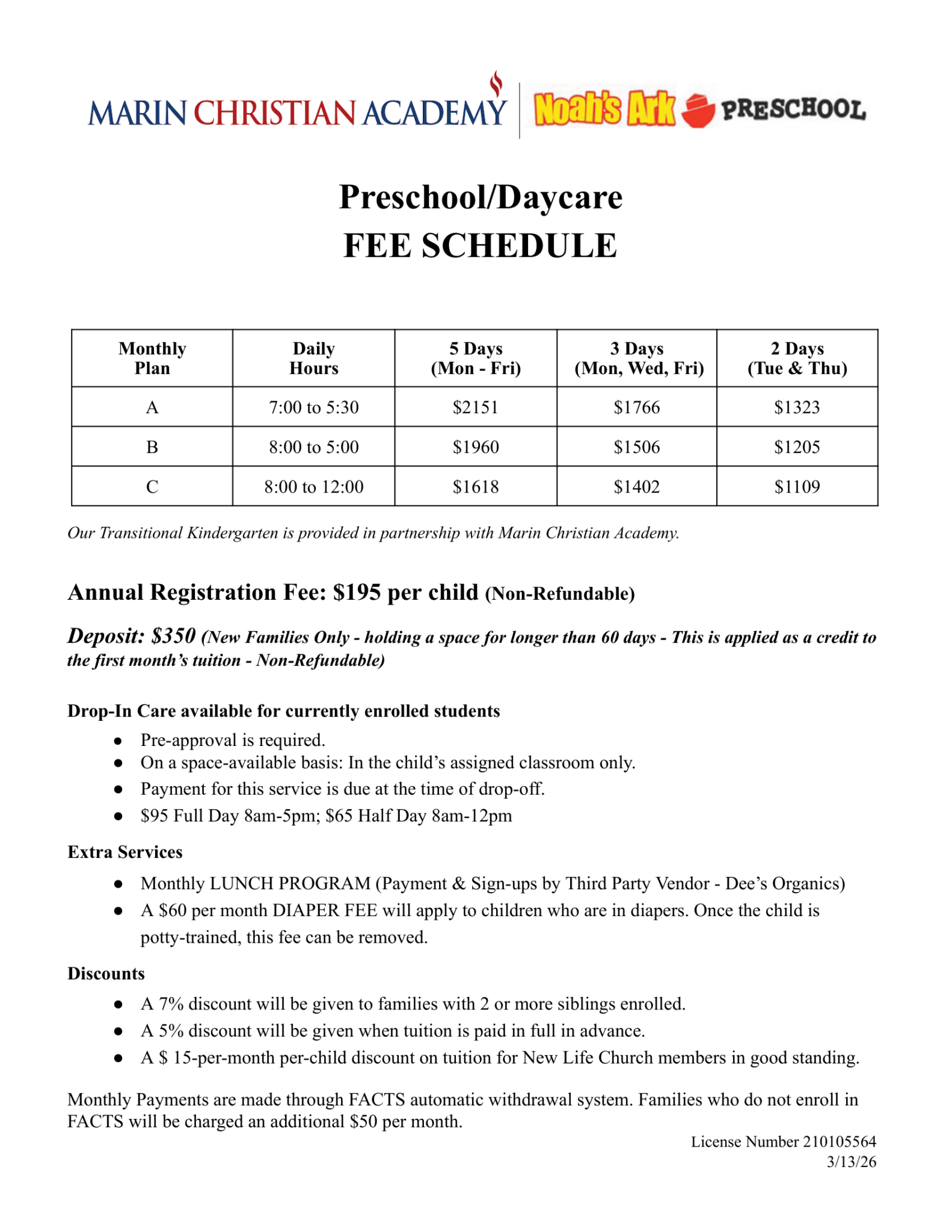 PRESCHOOL/DAYCARE FEE SCHEDULE