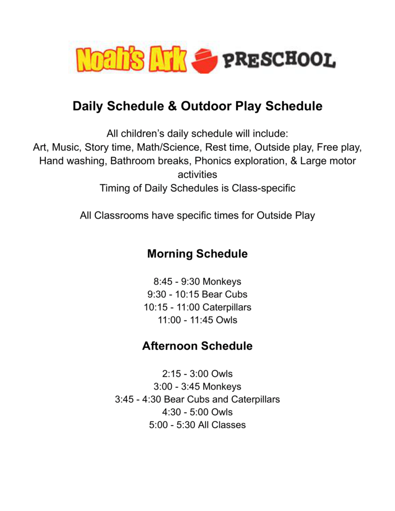 Daily Schedule & Outdoor Play Schedule: For Class Specific Daily Activites please visit the “Our Classrooms” Tab at the top and select your child’s class